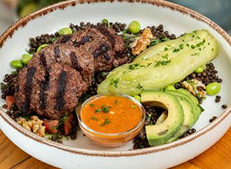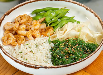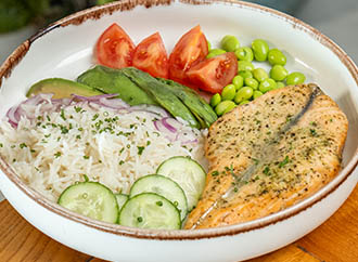 SALMON Contents: Basmati rice, avocado slices, cherry tomatoes, red onion, cucumber, edamame. Price: 600 TL