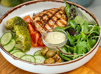 CHICKEN Contents: Roasted bell peppers, cherry tomatoes, cucumber, grilled black olives, chef's special sauce, broccoli. Price: 540 TL