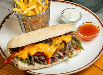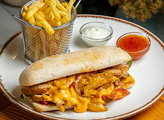 BBQ SAUCE CHICKEN SANDWICH Contents: Prepared with sautéed peppers, red onion, cherry tomatoes and mushrooms, then served with melted cheddar cheese and spicy potatoes. Price: 750 TL